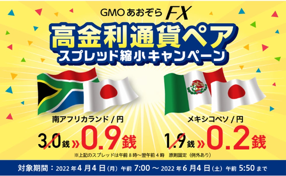 GMOあおぞらネット銀行株式会社(以下、当社)は、2022年4月4日から2022年6月4日までの期間中、店頭外国為替証拠金取引 「GMOあおぞらFX」のお客さまを対象に、南アフリカランド/円、メキシコペソ/円のスプレッド縮小キャンペーンを開催いたします。南アフリカランド/円、メキシコペソ/円は、高金利通貨としてスワップ(金利差調整)運用に魅力があります。