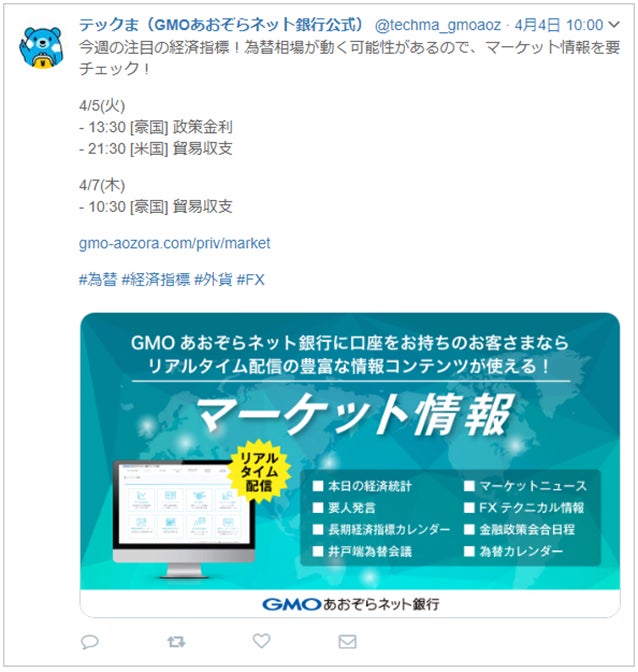 公式Twitter「テックま(@techma_gmoaoz)」で、注目の経済イベント情報を毎週月曜日の10時に配信しています。そのほか、インターネットバンキング上に豊富な情報コンテンツをご用意していますので、お取引のご参考としてぜひご活用ください。