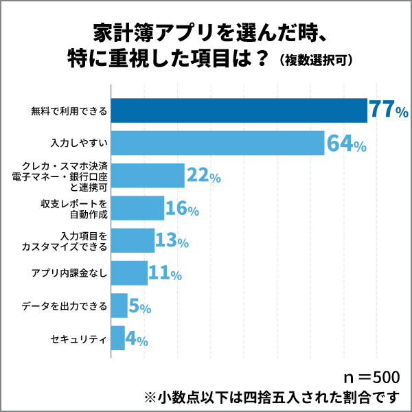 家計簿アプリを選ぶ時に特に重視した項目では「無料で利用できる」が最も多く、続いて「入力しやすい」、次に「クレジットカード・スマホ決済・電子マネー・銀行口座と連動できる」という結果になりました。