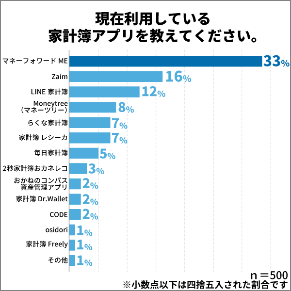 家計簿アプリを使ってお金を管理していらっしゃる方を対象に、利用している家計簿アプリを聞いたところ、「マネーフォワード ME」が33%と一番多く、次いで「Zaim」の16%となりました。