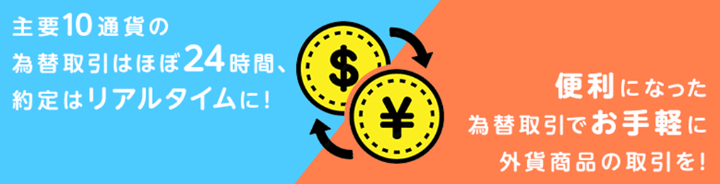 このたび提供を開始する、リアルタイムでの為替取引サービスでは、取引受付時間内であればいつでもお好きなタイミングで為替取引を行うことができるようになります。取引後の外貨は、すぐに外国株式(米国株式、中国株式、シンガポール株式)、外貨建債券、外貨建MMFといった外貨建商品の買付にご利用いただけます。また、為替取引画面も刷新し、スマートフォンから視認性の高い画面で為替のレート確認・取引・注文照会等を行うことができるようになり、初めてのお客さまにもスムーズに為替取引を行っていただけるようになります。