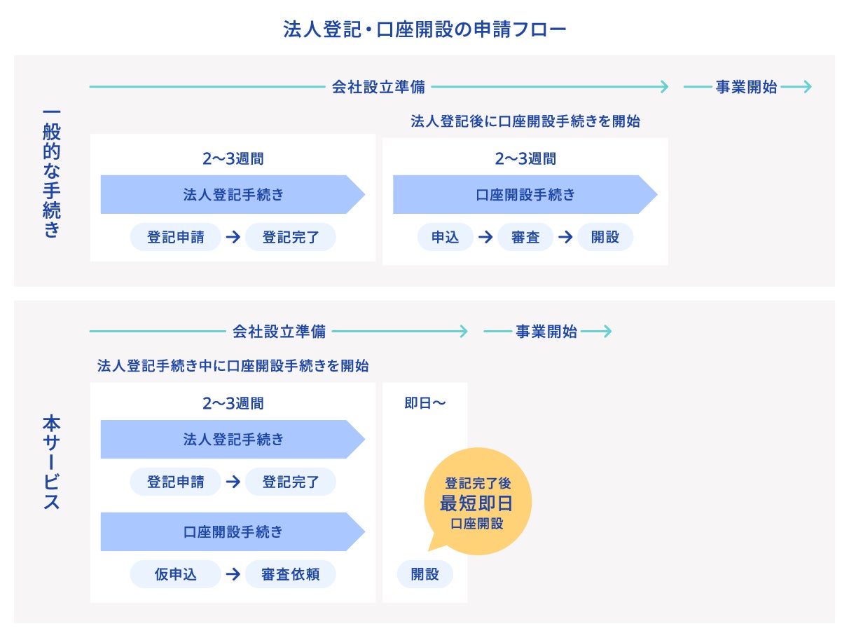 これにより、法務局への法人登記申請の準備が整った段階で法人口座の開設申込ができ、法人登記完了後は最短で当日に口座を開設することが可能となるため、より早く事業を開始することができます。