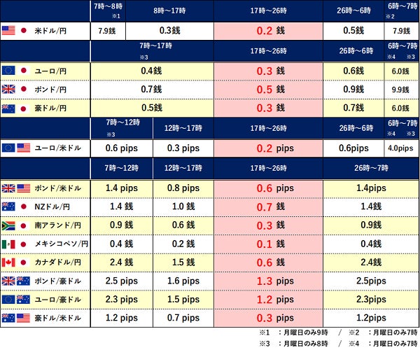 ※主要経済指標発表時等の急変時、国内外の休日や平日早朝など著しい流動性低下時はやむをえずスプレッドを拡大する場合がございます。 メンテナンス時間(火曜日~金曜日 各日5:55~6:10、土曜日5:50~月曜日7:00)は適用時間に含まれません。