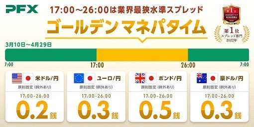 株式会社 マネーパートナーズ(代表取締役社長:福島秀治、本社:東京都港区、以下「当社」)は、3月10日より17時~26時を『ゴールデン マネパタイム』とし、業界最狭水準スプレッドを提示するキャンペーンを実施いたしておりますが、ご好評につき4月も全13通貨ペアで業界最狭水準スプレッドを提示いたします。