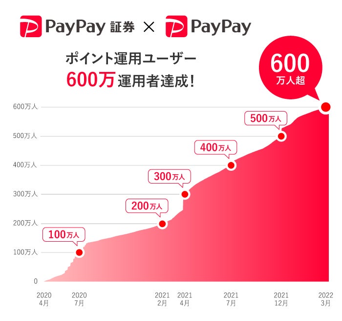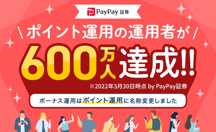 「資産運用を、より身近に。」をミッションに運営するスマホ証券、PayPay証券株式会社(東京千代田区、代表取締役:内山 昌秋、以下PayPay証券)とPayPay株式会社(東京都港区、代表取締役社長執行役員CEO:中山 一郎、以下PayPay)は、キャッシュレス決済サービス「PayPay」のミニアプリ※1で提供する投資疑似運用体験ができるサービス「ポイント運用」が2022年3月に、2020年4月15日のサービス提供開始から1年11カ月で、600万運用者を突破したことをお知らせします。これは“ポイント運用サービス”を提供する主要な疑似投資ポイント運用サービス取扱業者で最速記録※2です。また、「ポイント運用」の600万運用者達成と2周年を記念した、キャンペーンを2022年4月25日から実施します。