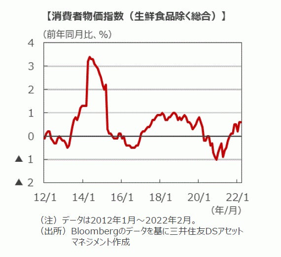 ■日本の消費者物価指数(生鮮食品除く総合)は、最新2月が前年同月比+0.6%と7カ月連続の上昇となりました。ここ数年の物価動向を見ると、消費税が8%に引き上げられた2014年には増税の影響から同+2%超となっていましたが、その影響が剥落してからは+1%以下、もしくはマイナスで推移していました。