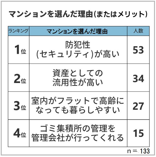 マンションを購入したと回答した方133人に「マンションを選んだ理由もしくはメリット」を聞いたところ、上位が以下の結果となりました。