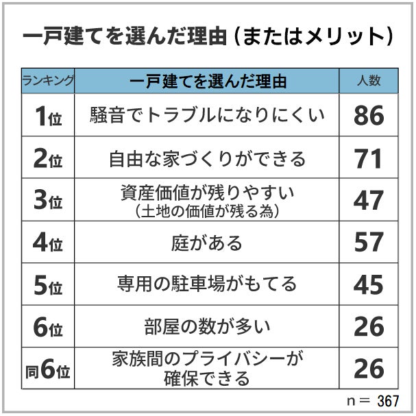 一戸建てを購入したと回答を頂いた方367人に「一戸建てを選んだ理由もしくはメリット」を記述式で聞いたところ、上位が以下の結果となりました。