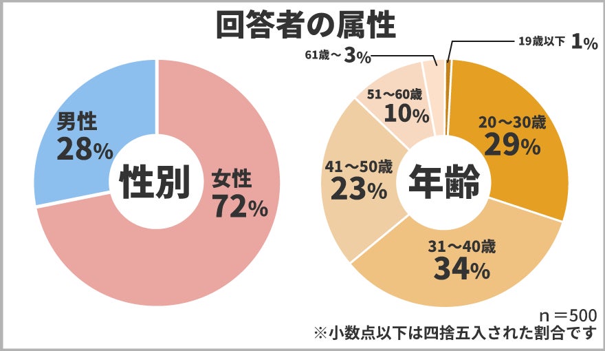 「ペットに関するアンケート」にご協力を頂いたのは、19歳以下から61歳以上の男女500人、属性は以下のとおりです。