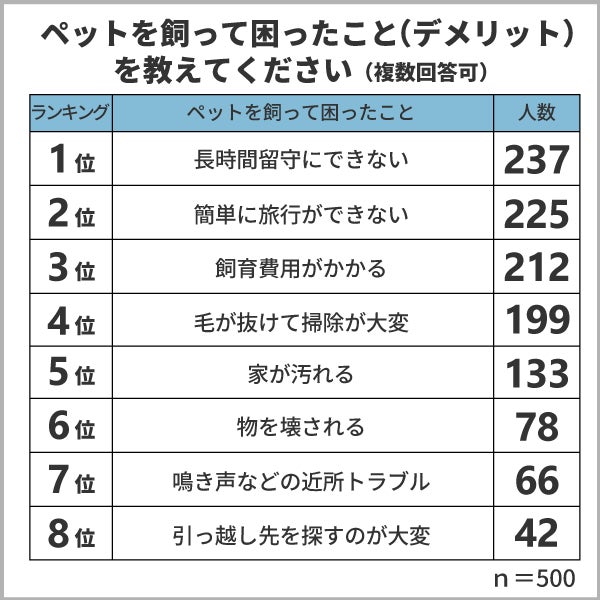 ペットを飼っていて困ったことを聞いてみたところ、「長時間留守にできない」「簡単に旅行ができない」「飼育費用がかかる」の声が多く届きました。