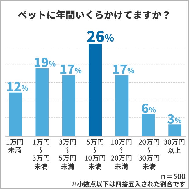 続いて、ペットを飼っている方に「ペットに年間いくらぐらい使っていますか?」と質問したところ、年間5万円以上ペットに使っている方が5割を超える結果となりました。
