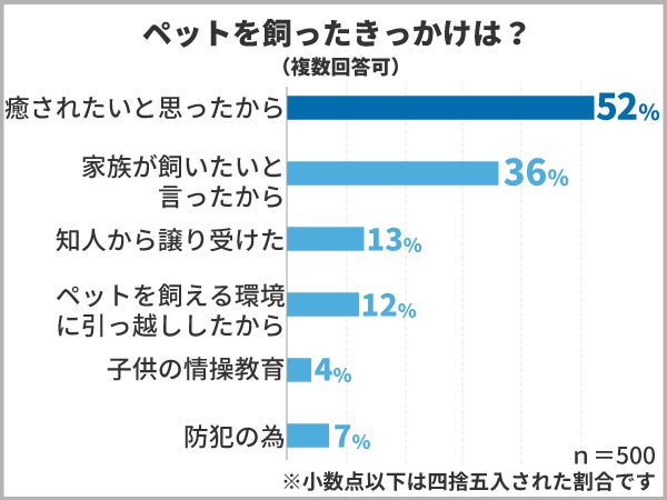 「ペットを飼ったきっかけ」を聞いてみたところ、「癒されたいと思ったから」の声が多く届きました。また、「子供が飼いたいと言ったから」などご家族の方の声がペットを飼うきっかけになった方も多くいらっしゃいました。