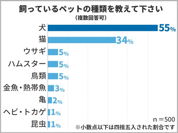 現在飼っているペットの種類を複数回答で聞いたところ、一番多かったのは「犬」で55%、続いて「猫」の34%、「ウサギ」5%、「ハムスター」5%、インコなどの「鳥類」5%の結果となりました。