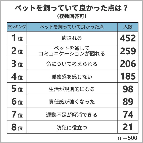 ペットを飼っている男女500人に「ペットを飼っていて良かった点」を聞いたところ、1位は「癒される」、2位は「ペットを通してコミュニケーションが図れる」、3位は「命について考えられる」の結果となりました。