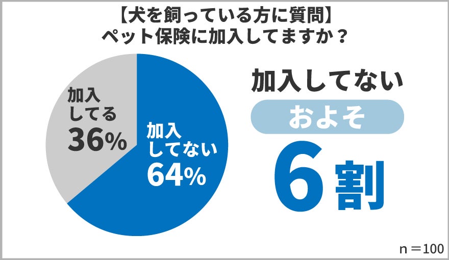 犬を飼っている方男女100名に「ペット保険に加入しているか」聞いたところ、6割以上の方がペット保険には加入してませんでした。