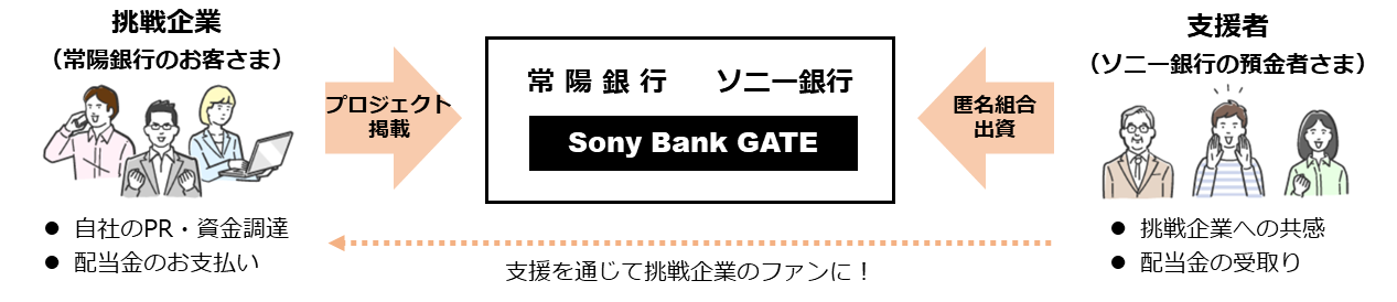 今回の連携協定により、茨城県を中心として先進性や社会性に富む事業を行っている、常陽銀行のお取引先を挑戦企業としたファンドを Sony Bank GATE で組成し、ソニー銀行のお客さまに投資という形での支援を募ります。なお、インターネット専業銀行と地域金融機関によるクラウドファンディング領域での連携は、全国初の取り組みとなります。