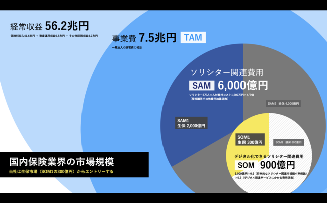 国内保険業界の経常収益は56.2兆円の巨大市場です。この中の事業費7.5兆円をTAM、ソリシター関連費用6,000億円をSAMと定義しています。