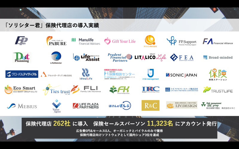SEIMEI株式会社(本社:東京都港区 CEO:津崎桂一)はソリシター君の保険代理店ユーザー数が11,000を突破したことをお知らせ致します。