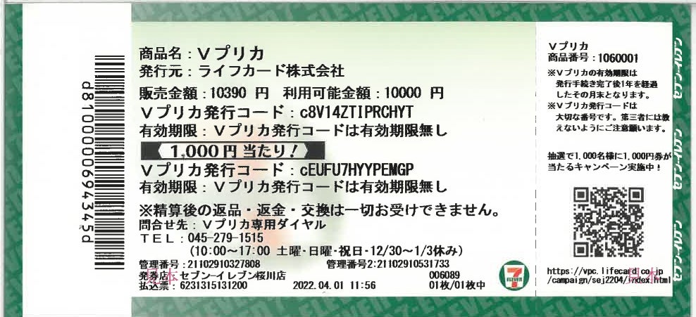 Vプリカ購入後、レジで受け取るチケットに【1,000円当たり!】の記載があれば当たりです。