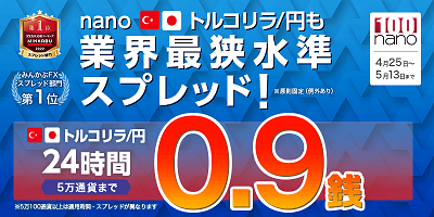 - 【nano】5万通貨までは24時間「トルコリラ/円 0.9銭」業界最狭水準スプレッドを提示!