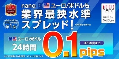 - 【nano】3万通貨までは24時間「ユーロ/米ドル 0.1pips」業界最狭水準スプレッドを提示!