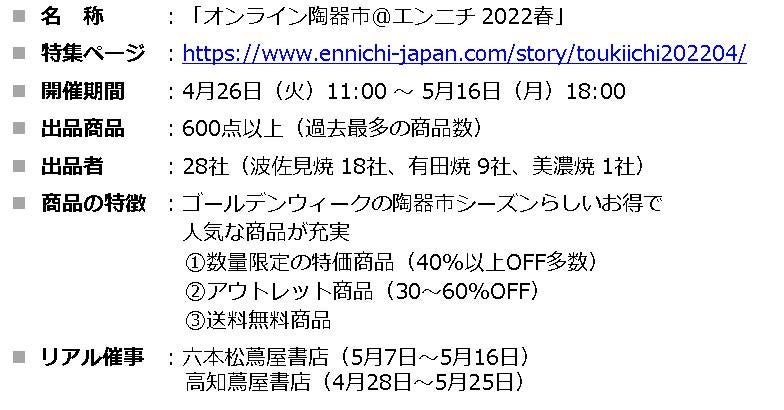 株式会社ふくおかフィナンシャルグループ(取締役社長 五島 久、以下「FFG」)傘下のiBankマーケティング株式会社(代表取締役社長 明石俊彦、以下「iBank社」)は、「地域総合商社事業」におけるオンラインストア「エンニチ」を活用した取組みとして『オンライン陶器市@エンニチ 2022春』を開催いたします。