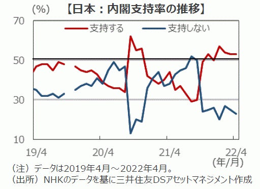 ■日本では、7月に参議院選挙が予定されています。今回は、昨年10月に岸田首相が就任して以来、事実上初めての政権評価となる『選挙』です。岸田内閣の支持率は、NHKの世論調査(4月11日時点)によると53%と、発足以来概ね50%超を維持しており、今回の参議院選挙で勝利することが、今後の安定政権に向けて重要となります。