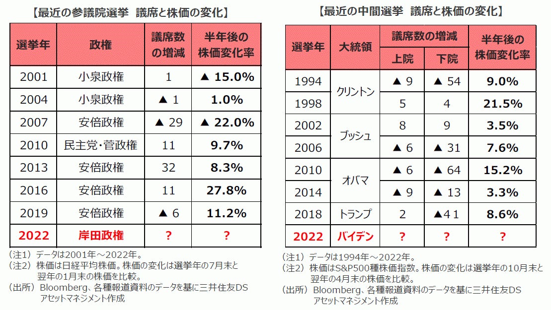 4月24日、フランス大統領選挙の決選投票が行われ、マクロン大統領の再選が決定しました。今年は、夏には参議院選挙が、秋には米国で中間選挙が予定されており、主要国では『選挙』が大きな政治的イベントとなっています。今回は、今年の参議院選挙と中間選挙のポイントと、過去にこれらの『選挙』の後、株式市場がどう反応したのかを振り返りながら、『選挙』と株価の関係性について考えてみたいと思います。