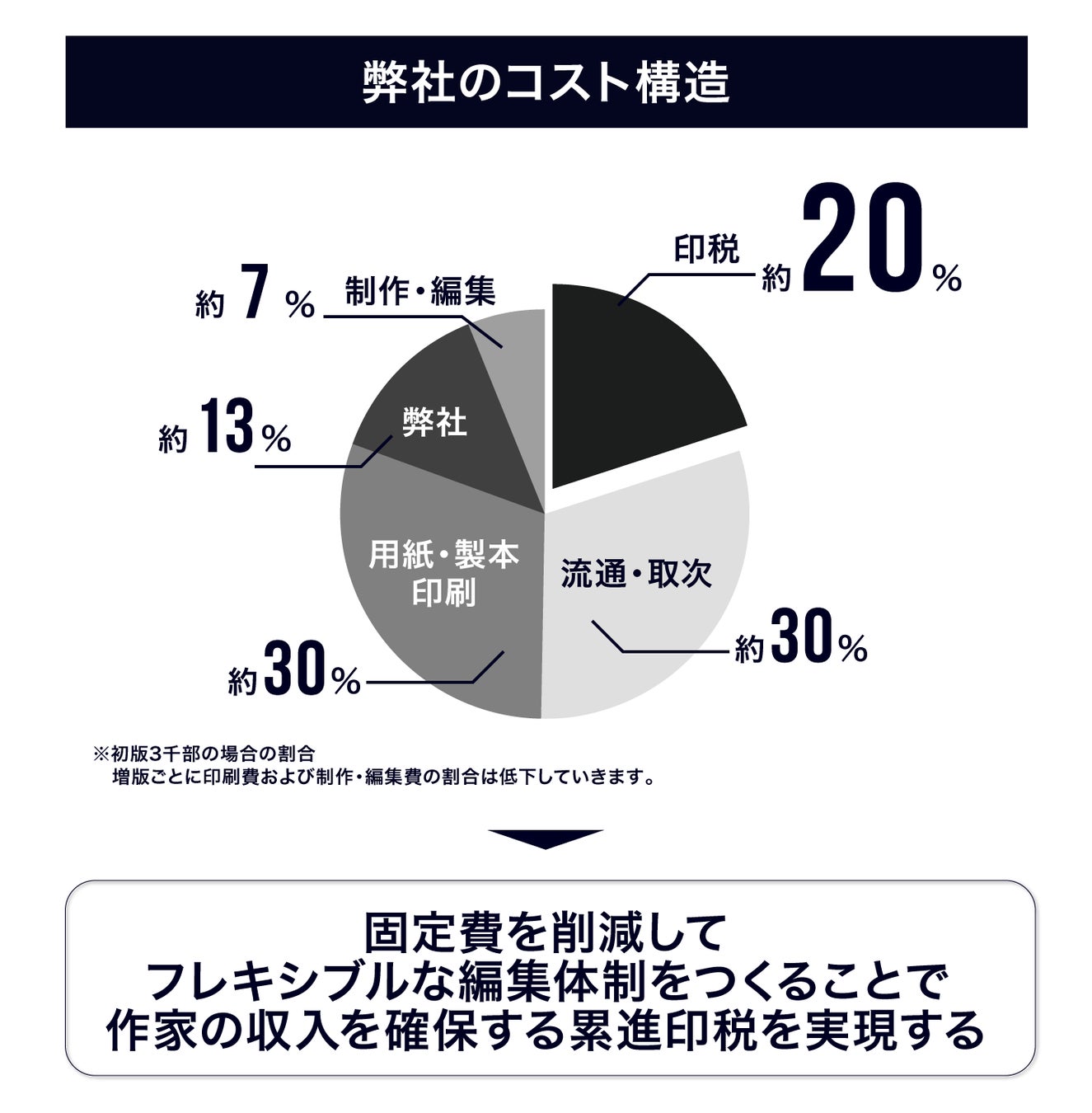 ひろのぶとの強みは、印税率を最大5割にし、「累進印税(ダイナミックプライシング)」で業界の革新と作家の収入増を目指していることです。この仕組みを実現するためにも、弊社では固定費を削減し、フレキシブルな編集体制で出版を行います。また、日本では珍しい編集者の印税契約の導入もいたします。さらに、株主とともに本をつくる、ファンクラブ的な組織を目指していることも弊社の特徴です。