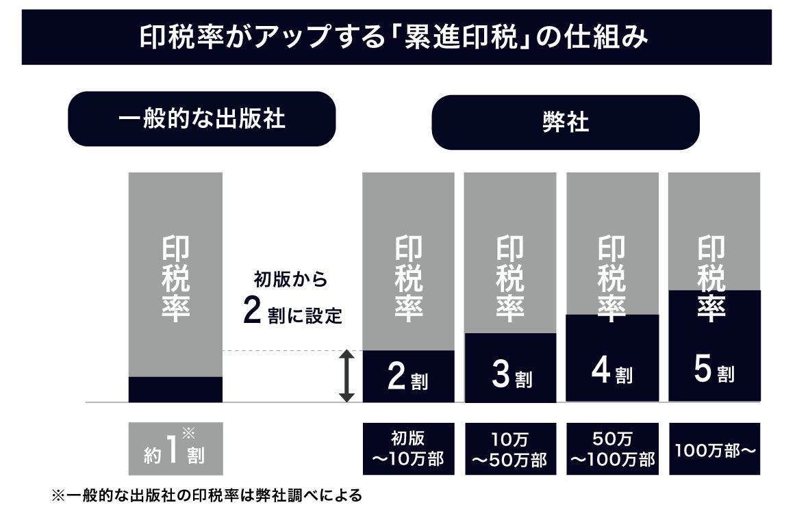 ひろのぶと株式会社は、これまで出版業界の慣習によって約1割(弊社調べによる)と決められていることが多い印税率を、はじめから2割に設定することで、作家がこれまで以上に収入を得られる世界を目指しています。さらに「累進印税」と名づけた、売上部数に応じて最大5割まで印税率がアップする仕組み、「ダイナミックプライシング」も導入します。
