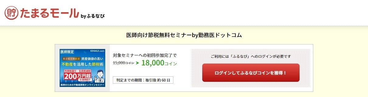 医師の方のための節税情報サイト「勤務医ドットコム」による不動産節税オンラインセミナーとなりますので、ご興味がございましたら、ぜひこの機会に「たまるモール」からお申し込みください。