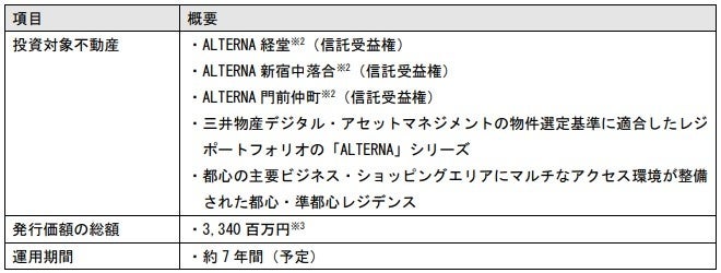 今回の資産裏付型ST(以下 本ST)は、MDMがアセット・マネージャーを、三菱UFJ信託銀行が受託者を務める都内レジデンス三物件(以下 本三物件)の信託受益権を裏付資産とし、SBI証券を主幹事証券として主に個人投資家向けの提供を予定しています。本三物件はMDMがアセット・マネージャーを務めるファンドで現在運用中の物件であり、MDMの物件選定基準をクリアした「ALTERNA(オルタナ)」シリーズの物件です。