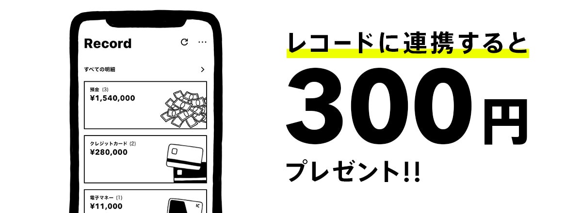 | 内容 | 開催期間中に、「銀行口座」・「クレジットカード」のいずれか一つ以上を、レコード機能を使ってご連携いただいた方に、もれなく現金300円をプレゼントします。