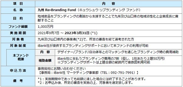 株式会社ふくおかフィナンシャルグループ(取締役社長 五島 久、以下「FFG」)は地域活性化を始めとした地方創生の取組みを進めており、iBankマーケティング株式会社(代表取締役社長 明石 俊彦、以下「iBank社」)が行う「地域総合商社事業」と連携し、九州の魅力をカタチにするための補助金制度「九州 Re-Branding Fund」(以下、本ファンド)を活用したブランディングサポートを実施しております。本ファンドは、2021年9月にFFGが新設したもので、九州及び山口県内の事業者の皆さまに対して、iBank社が提供する「ブランディングサポート」費用の7割(上限50万円)を補助する制度です。
