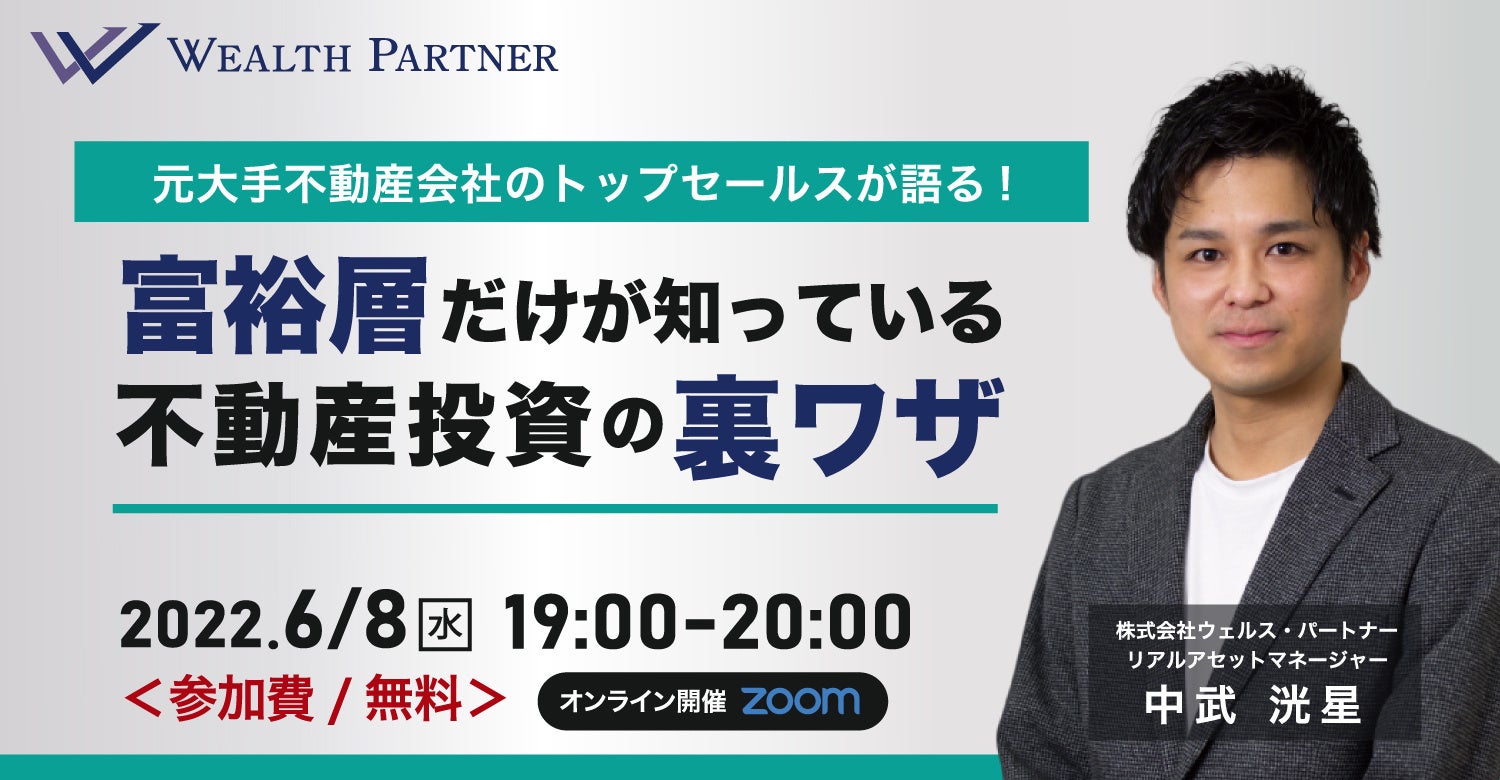 富裕層向けにIFA事業始め、資産運用のコンサルティングを行う株式会社ウェルス・パートナー(代表取締役:世古口俊介、本社:東京都港区、以下「当社」)は、オンラインセミナー「元大手不動産会社のトップセールスが語る! 富裕層だけが知っている不動産投資の裏ワザ」を2022年6月8日(水)19:00〜20:00に開催いたします。