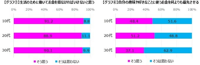 「生活のために働いてお金を得なければいけないと思う」と答えた割合を年代別に見ていくと、「そう思う」で最も高いのが10代の91.2%、続いて30代が90.1%、20代が88.9%という結果でした。【グラフ③】