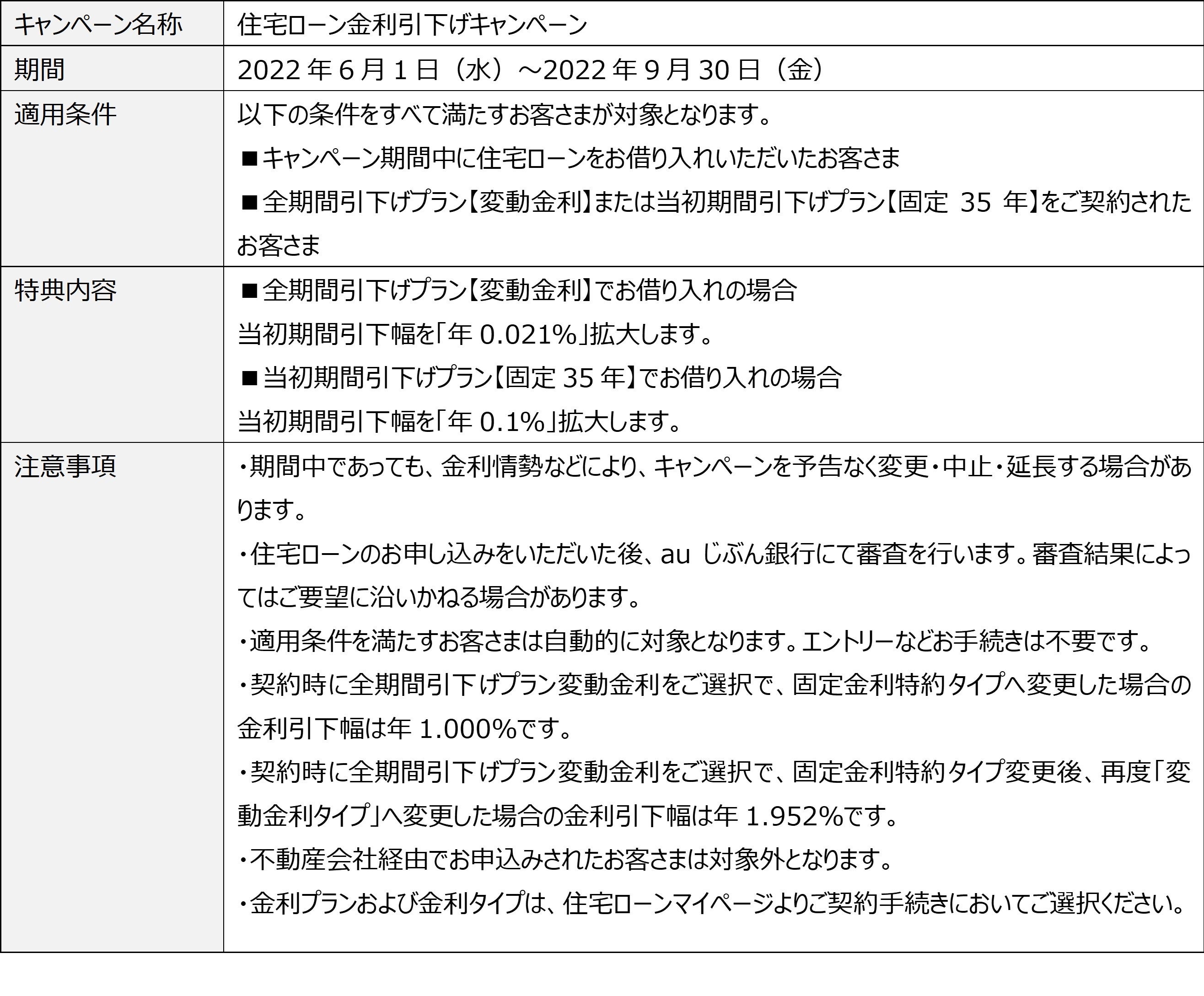 auじぶん銀行株式会社(本社:東京都中央区、代表取締役社長:臼井 朋貴、以下 auじぶん銀行)は、2022年6月1日から「住宅ローン金利引下げキャンペーン」(以下 本キャンペーン)を実施します。