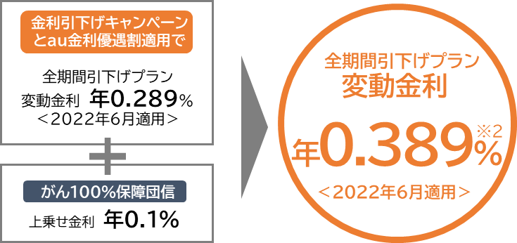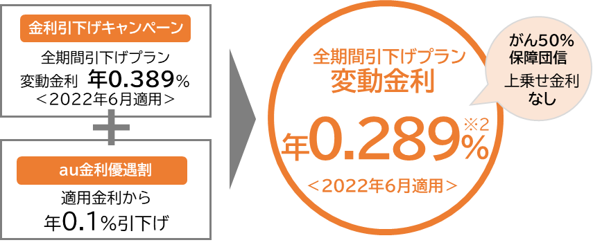 さらに、「au金利優遇割」※1を利用することで、住宅ローンの金利が年0.1%引下げとなります。例えば、本キャンペーンと「au金利優遇割」が適用された場合、「全期間引下げプラン 変動金利」なら適用金利は「年0.289%」となります。加えて満50歳までのお客さまについては「がん50%保障団信」の上乗せ金利はありません。