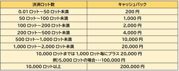 期間中に100 ロット以上決済取引されたお客様にもれなくキャッシュバック(最大3万円)いたします。