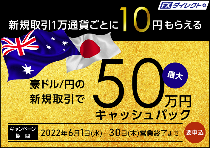 キャンペーンに申し込まれたお客さまに、期間中におけるFXダイレクトプラスでの豪ドル/円の新規取引合計数量に応じて、最大500,000円【新規取引1万通貨ごとに10円】をキャッシュバックします。