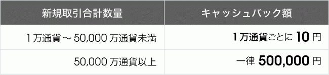 新規取引合計数量が5,000万通貨 ⇒ 50,000円キャッシュバック