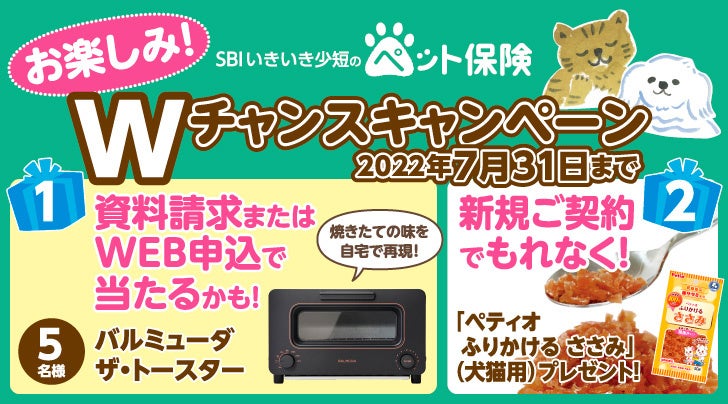 【SBIいきいき少短】ペット保険の資料請求またはWEB申込で「バルミューダ ザ・トースター」が抽選で当たる!~新規ご契約でもれなく「ペティオ ふりかけるささみ」をプレゼント~