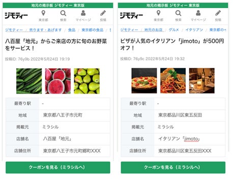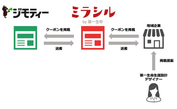 第一生命の生涯設計デザイナーが、地域企業から集めたクーポン情報をジモティーとミラシル(第一生命が運営する情報サイト)に掲載します。地域企業ならではのお得な商品情報や割引クーポンが掲載され、ジモティー、ミラシルを利用する地域住民の方は無料で利用することが可能となります。