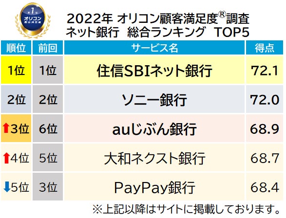 2022年 オリコン顧客満足度(R)調査 『ネット銀行』ランキング