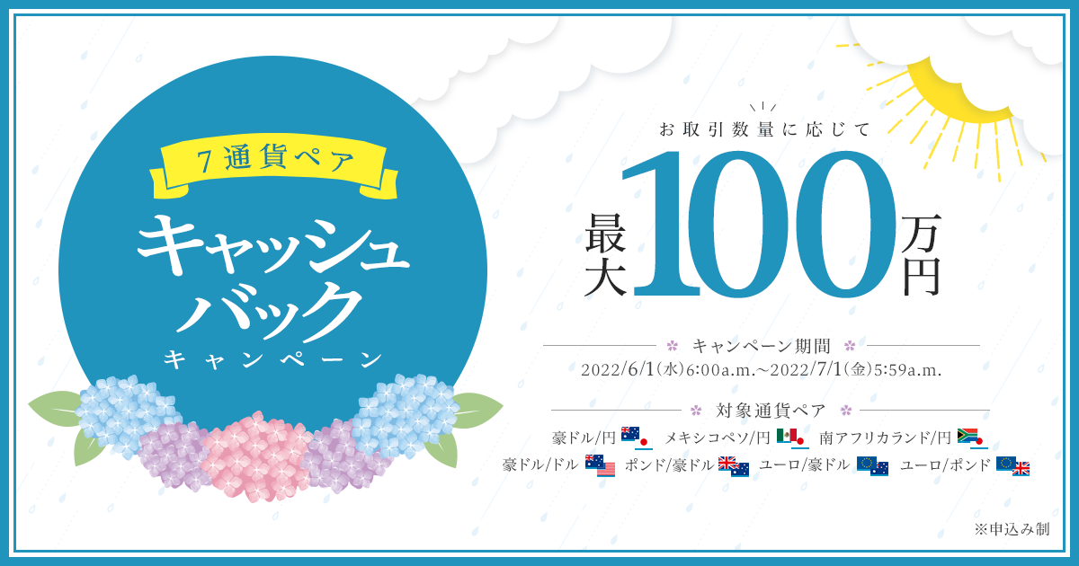 昨今、原油や金属、穀物など国際商品価格の上昇などによって、世界的にインフレ懸念が一段と高まっていることを受けて、政策金利が高水準の通貨ペアに加えて、資源国通貨の代表である豪ドルを絡めた通貨ペアを対象としたキャッシュバックキャンペーンを開始いたしました。対象通貨ペアを主に取引される投資家の方々にとってメリットをご享受いただけるキャンペーンとなります。