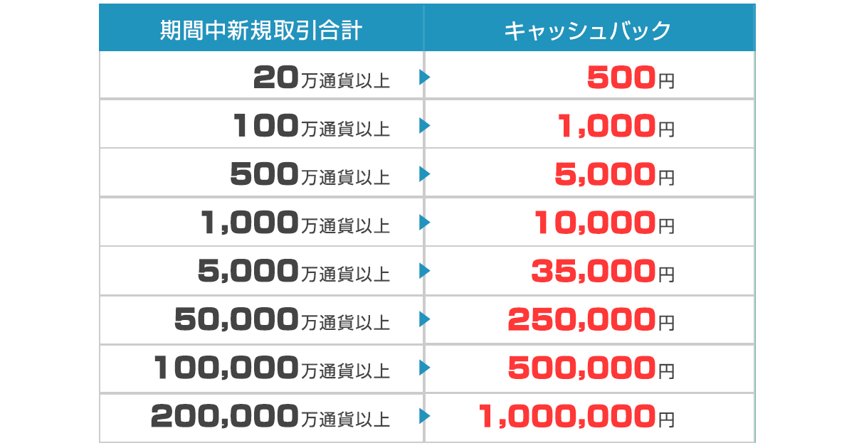 本キャンペーンにお申し込みいただき、『選べる外貨』での対象通貨ペア(豪ドル/円、メキシコペソ/円、南アフリカランド/円、豪ドル/ドル、ポンド/豪ドル、ユーロ/豪ドル、ユーロ/ポンド)のお取引において、期間中に以下の条件を達成され、かつ、キャンペーン終了時点の『選べる外貨』取引口座残高が30万円以上の方を対象に、7通貨ペアを合計した新規取引合計額に応じてキャッシュバックいたします。