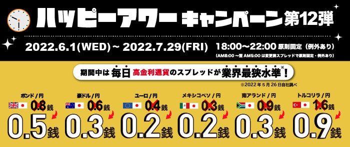 トレイダーズホールディングス株式会社の完全子会社であるトレイダーズ証券株式会社(本社:東京都港区、代表取締役社長:須山剛)は、店頭デリバティブ取引「みんなのFX」におきまして、2022年6月1日(水)より「ハッピーアワーキャンペーン第12弾」を実施いたします。
