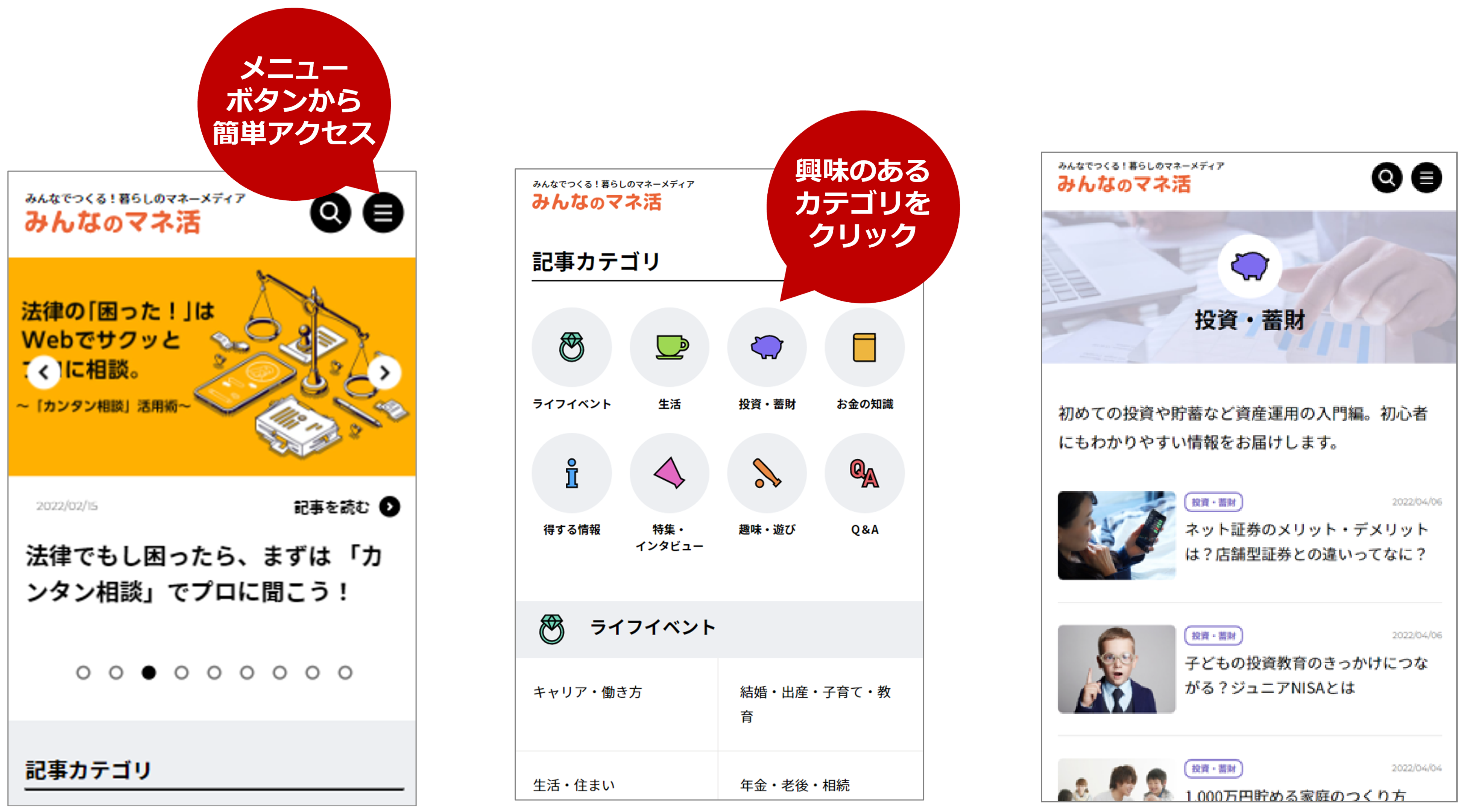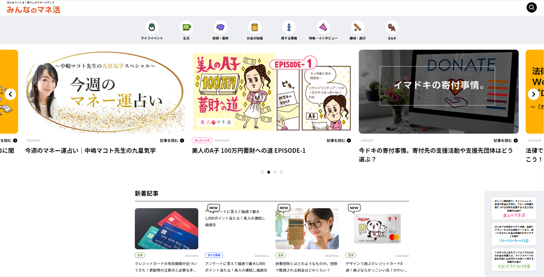 新しく公開した「みんなのマネ活」には、暮らしを豊かにするお金の使い方や投資や運用に関する2,300本以上の記事が掲載されています(6月3日時点)。キャッシュレスや税金、保険など「生活」に役立つ情報をはじめ、ポイ活や節約術などの「得する情報」、「投資・蓄財」に関する情報、経済のキーワードなどを解説する「お金の知識」など、従来よりもさらに幅広い層に楽しんでいただけるコンテンツを用意しました。