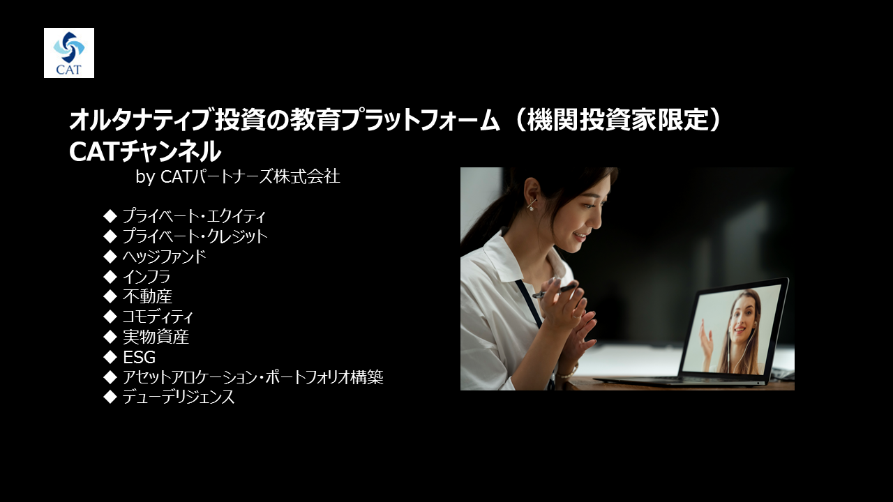 CATパートナーズ株式会社(東京都港区、代表取締役社長志賀祥子、第2種金融商品取引業者及び電子募集取扱業務登録)は、機関投資家限定のオルタナティブ投資の教育プラットフォーム【CATチャンネル】をプレローンチします。6月上旬よりサービスをオープンにすると同時に機関投資家の方々へのご案内を開始します。