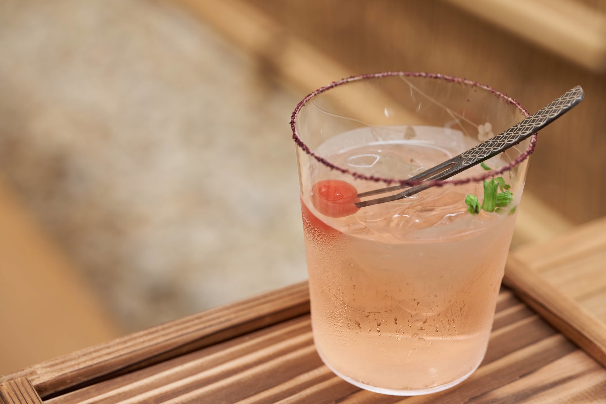 「季の美 京都ドライジン」をベースに、ライム、コリアンダー ビターズ、自家製の赤紫蘇シロップを合わせ香り高い味わいに仕上げました。アクセントとしてグラスの縁に赤紫蘇パウダーを付け、小梅を付けたピックをかんざしに見立てて飾りました。